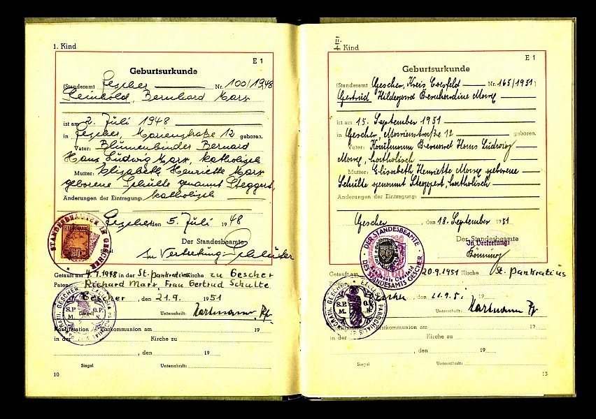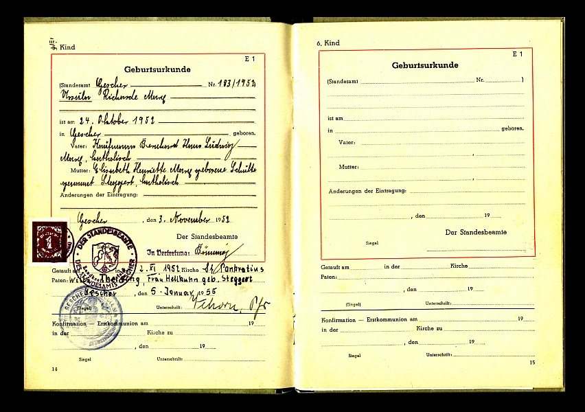 Gertrud Hildegard Bernhardine Marx wird Gerhild genannt. Sie hat erst spät erfahren, dass ihr offizieller Vorname gar nicht Gerhild ist. Es gibt Schulzeugnisse, Impfzeugnisse usw. sogar das erste Sparbuch auf den Vornamen Gerhild.